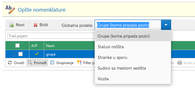 Kada odaberemo globalnu podelu, za navedenu nomenklaturu možemo vršiti na njoj poslovne promene. Unos - klikom na dugme iz menija na [Novi] otvara nam se forma ispod stavke za unos nove stavke nomenklature. Ispravak - Klikom na ikonu za ispravak u navedenom redu ulazimo u formu i ispravljamo naziv nomenklature. Brisanje - ako želimo obrisati neke stavke u nomenklaturama štikliramo te stavke i kliknemo na dugme [Briši], nakon toga će biti obrisane sve nomenklature koje nisu bile pridruživane u drugim zavisnim programima. Znači ako je navedena nomenklatura negde bila upotrebljena, neće biti dozvoljeno njeno brisanje.